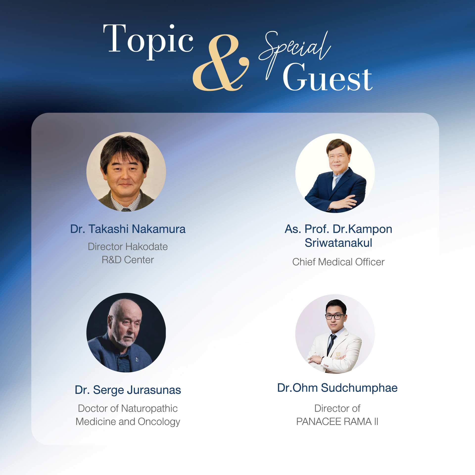 สำหรับการจัดการประชุมเชิงวิชาการระดับนานาชาติ ในครั้งนี้ มีหัวข้อสำคัญ ได้แก่ Asai Germanium As Non-toxic Cancer Treatment" โดย ดร. นากามูระ ทากาชิ ผู้อำนวยการศูนย์ R&D ฮาโกดาเตะ จากสถาบันวิจัยอาซาอิ เจอร์เมเนียม จำกัด"Clinical Experience Using Asai Germanium For Cancer Treatment" โดย Dr. Serge Jurasunas แพทยศาสตรบัณฑิต สาขาเวชศาสตร์ธรรมชาติและมะเร็งวิทยา และ "Immunology Therapy, iNKT" โดย ดร. ยาซูโอะ โคมูระ จาก Ringu Medical Center พร้อมบรรยายโดย รศ.ดร.นพ.กำพล ศรีวัฒนกุล ประธานเจ้าหน้าที่บริหาร สายงานการแพทย์ PANACEE BY BIOSKY