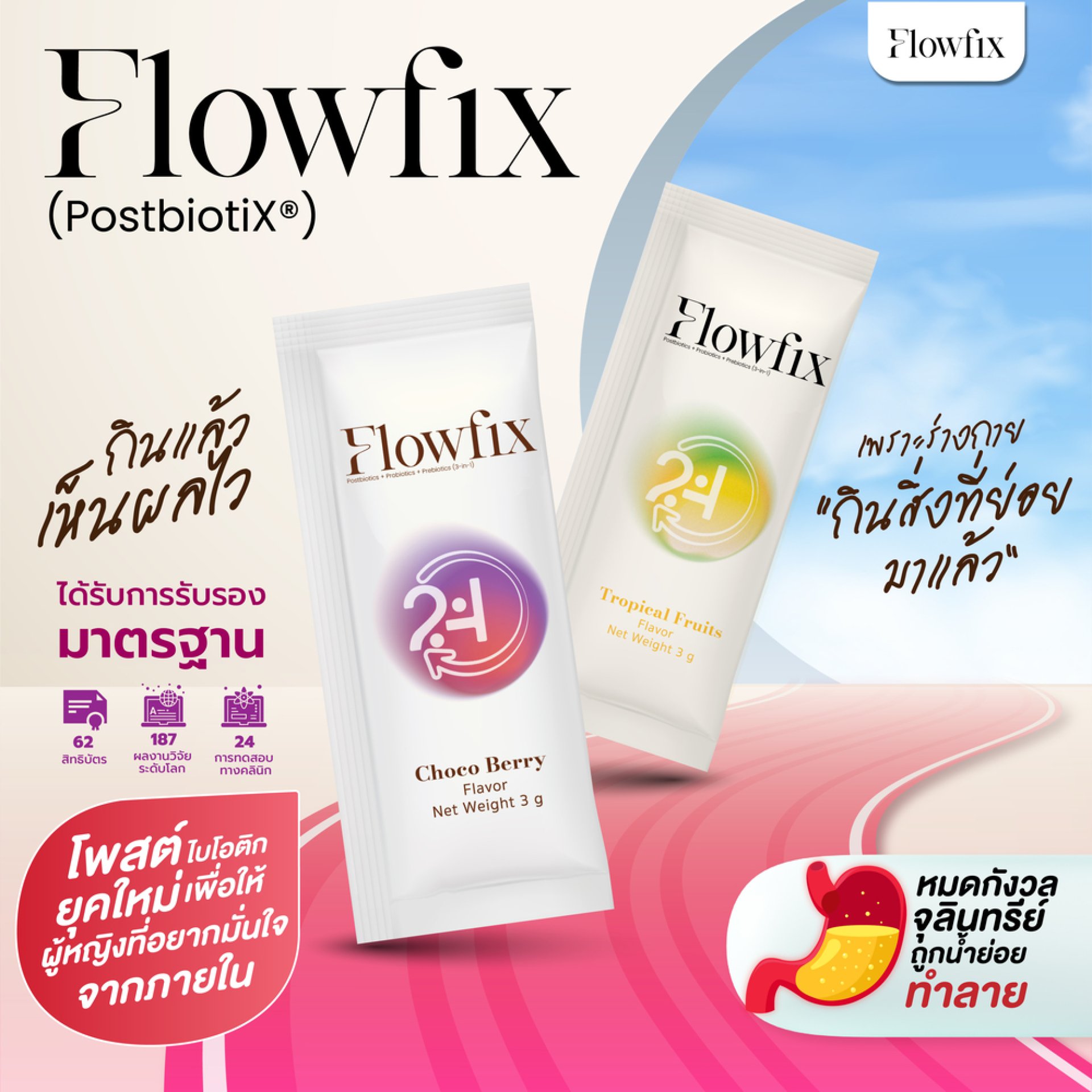 เนื่องจากการใช้ชีวิตของคนไทยในปัจจุบัน มีความเสี่ยงต่อการเกิดโรคมะเร็งลำไส้ และโรคตับ จากการรับประทานอาหารที่เกิดผลเสี่ยงต่อสุขภาพ และไม่มีการดูแลร่างกายที่ดี จึงต้องหาตัวช่วยในการปรับสมดุลร่างกายที่ดีด้วย Flowfix ผลิตภัณฑ์เสริมอาหารโพสไบโอติกส์ ที่อุดมไปด้วยจุลินทรีย์ดีที่มีประโยชน์ต่อร่างกาย ด้วยส่วนผสมอย่างที่คิดค้นมาเพื่อ ฟื้นฟูตับ ดูแลลำไส้ เสริมภูมิคุ้มกัน และระบบเผาผลาญ นวัตกรรมใหม่ ที่รวมเอา Postbiotics, Probiotics และ Prebiotics ไว้ในซองเดียว ช่วยเสริมฤทธิ์กันอย่างเป็นระบบ เพื่อผลลัพธ์ด้านสุขภาพที่ดีและเห็นผลเร็วที่สุด