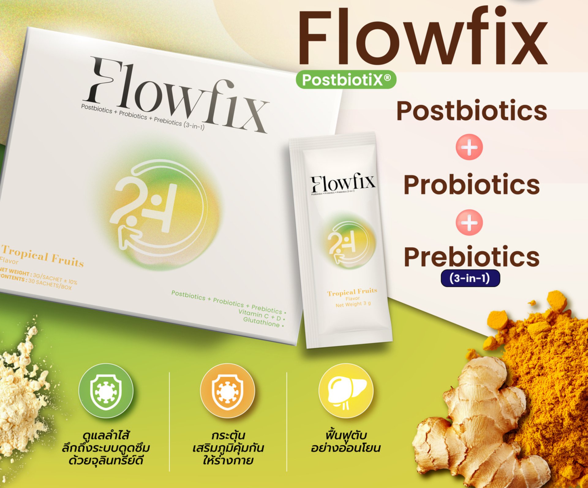 โพรไบโอติกและพรีไบโอติกต่างมีบทบาทสำคัญในการเสริมสร้างสุขภาพลำไส้ที่แข็งแรงแต่จะดีกว่าไหม ถ้าเรามีผลิตภัณฑ์อาหารเสริมที่ ช่วยเสริมจุลินทรีย์ดี และมีพรีไบโอติก และ โพสต์ไบโอติก ที่พร้อมใช้งานอย่าง Flowfix ผลิตภัณฑ์อาหารเสริมโพรไบโอติก ที่รวมเอา โพร พรี และ โพสไบโอติกไว้ 3 ชนิดพร้อมทำงานร่วมกันอย่างสมดุล ด้วยเครื่องการรับ อย่าง PostbiotiX® CBG-108 ช่วยดูแลภูมิคุ้มกัน ปรับสมดุลของระบบทางเดินอาหาร ช่วยเพิ่มจำนวนแบคทีเรียดีในลำไส้ ปรับสมดุลของระบบขับถ่ายได้ทันทีพร้อมสารสกัด